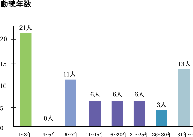 中途採用スタッフはほとんどいません。離職者は少なく、ベ